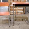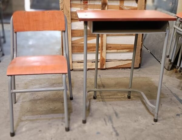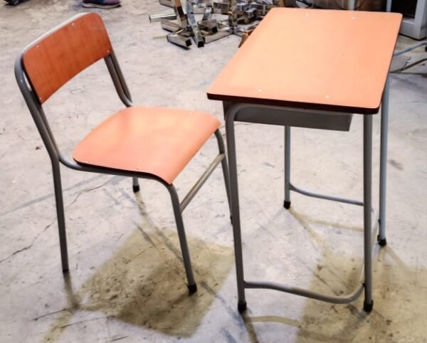 Simple non-attached desk and chair made from durable steel with wooden top. The backrest of the chair is curved for more comfort and the desk is made flat for writing comfort. Also, the chair has no arms.