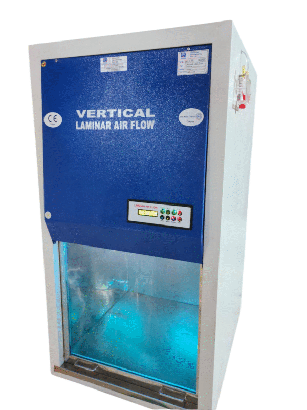 1. Ergonomic design for versatile usage, ease of use, plug & play system. 2. Designed so as to meet the requirements of US Federal Standard 209 B (BS 5295) providing particle free air to meet class 100 conditions 3. International Standards – UK Complied Certifications – ISO 9001:2015, CE. GMP. 4. Company is under Make in India & MSME Certified with International standard, certified model with duly mentioned brand name. Internal IQ/OQ/PQ Certification. 5. Material of Construction: – Outer Body- CRCA Sheet epoxy Powder coated Antibacterial & Antirust effect, 22 gauge OR Stainless Steel-304 PVC /Matt grit/ Sattin finish, 22 GAUGE 6. Work table top: – SS-304, PVC /Matt grit/ Sattin finish, 22 GAUGE. Single piece without any internal joint or welding 8. Air flow type: – Vertical Air flow from the top. 9. Air Flow Velocity: – 90 FPM ±20%, Inflow Velocity: 0.53 m/s, Down flow Velocity: 0.33 m/s 10. Statically balanced motor blower Assembly (Heavy Duty), 1440 rpm, 1⁄4 hp. Noise of the Blower is less than 55 dBA & Very low vibration